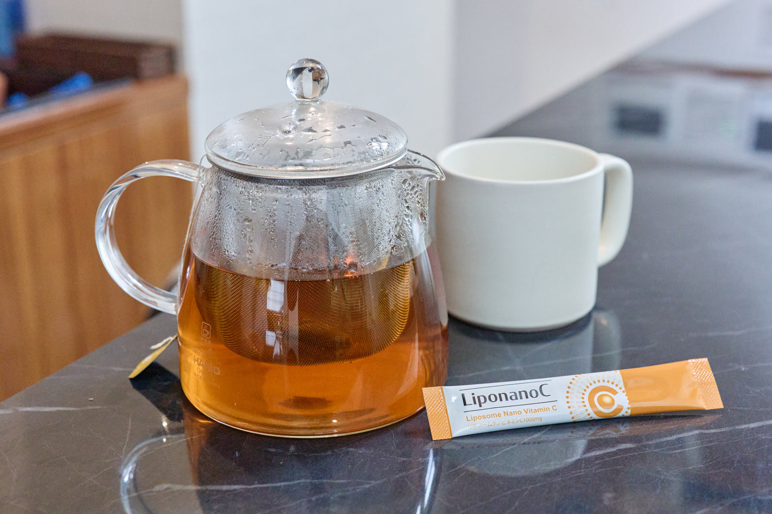 紅茶など温かい飲み物にいれてもリポソームに支障はありません。またジュースやスムージーに入れていただいても美味しくいただけます。