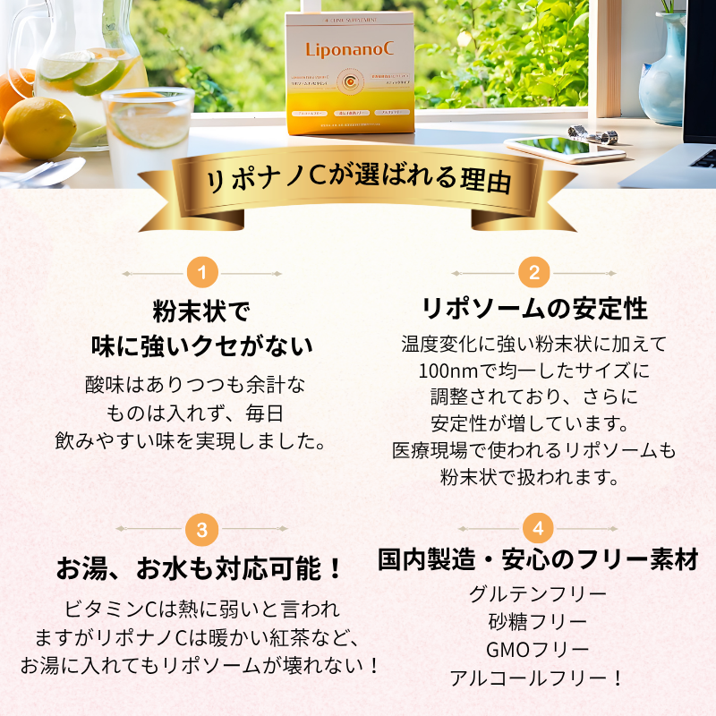 さらにリポソームの安定性と保存状態をよくするためにスプレードライの技術を利用し粉末状にしています。その安定性を生かし、リポナノCはお湯に溶かしてもビタミンCを失うことなく飲むことが可能です!
